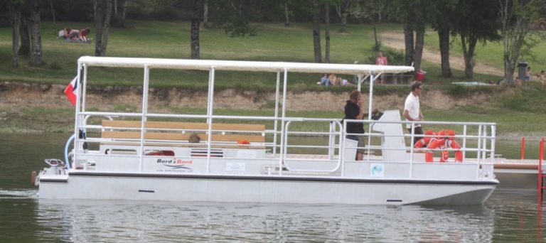 Le catamaran aluminium “Cantales” Le catamaran aluminium “Cantales” (chantier Bord à Bord) est équipé d’une propulsion électrique Hors-Bord et de batteries au plomb (AGM). Il peut accueillir 12 passagers à son bord (y compris les personnes à mobilité réduite) et permet une navigation à la journée sans nuisance sonore.