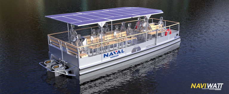 Commande un catamaran électro-solaire ! Début 2020, Naval Group passe commande à Naviwatt d’un catamaran electro-solaire de transport de passagers. Ce bateau travaillera dans la base militaire de Toulon. Il transportera jusqu’à 24 passagers d’un quai à un autre. Il ne parcourra que 300m, mais fera gagner 2h de marche...